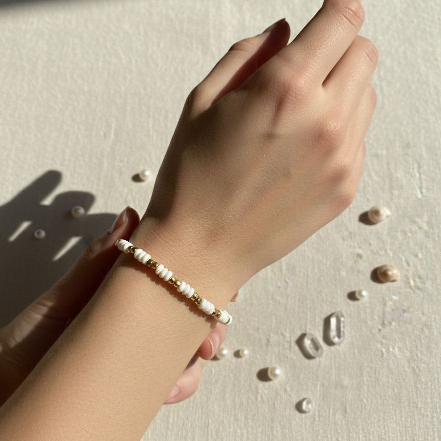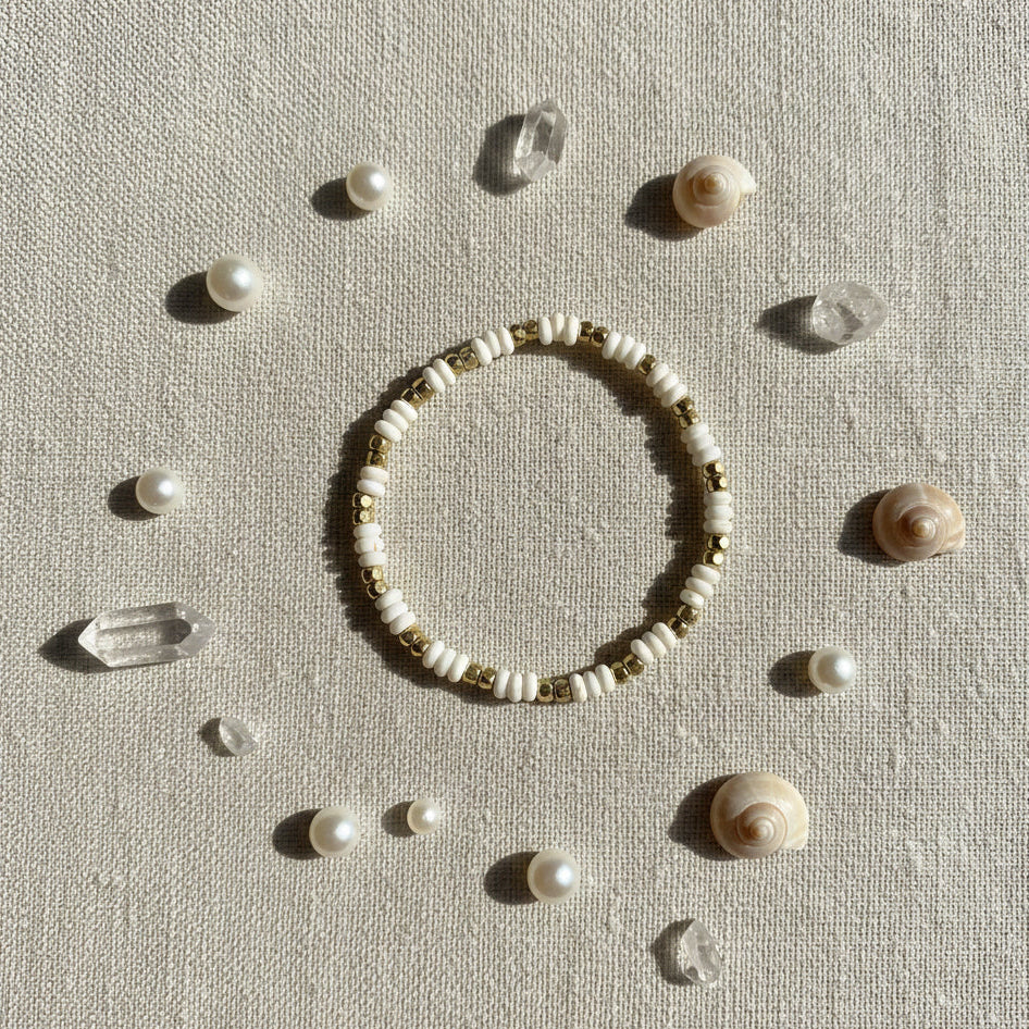Handcrafted elegance meets grounding energy. This stretch bracelet features lustrous mother-of-pearl beads paired with smooth hematite , creating a balance of shimmer and strength. Comfortable, versatile, and perfect for everyday wear or layering.