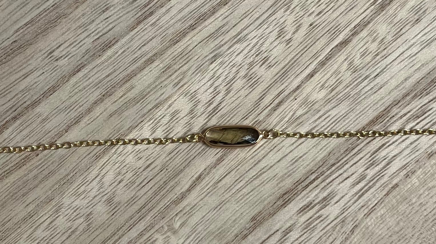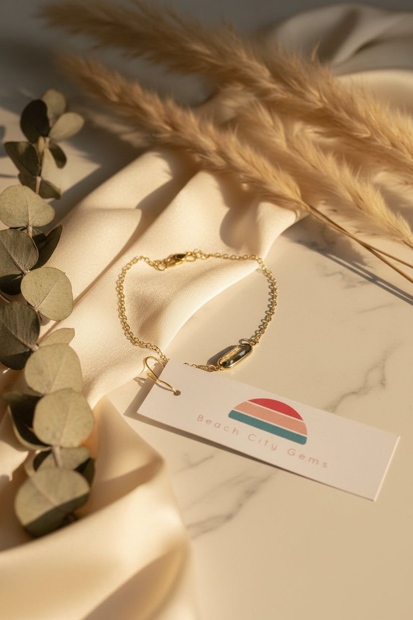 This elegant bracelet features a 14k gold-filled chain accented by a central smokey quartz stone, offering both durability and timeless style. The rich, translucent brown hues of the quartz create a sophisticated focal point, while the gold-filled chain ensures lasting shine and wear resistance. Perfect for those seeking refined craftsmanship paired with natural gemstone beauty.
